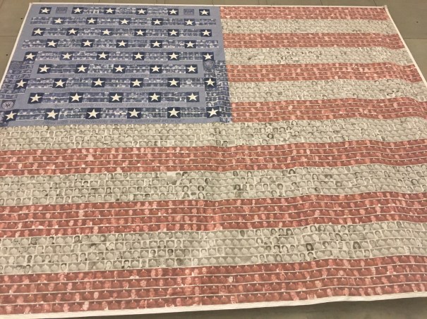 The flag with the pictures of the people who lost their lives in the towers in red and the fallen emergency workers in blue.